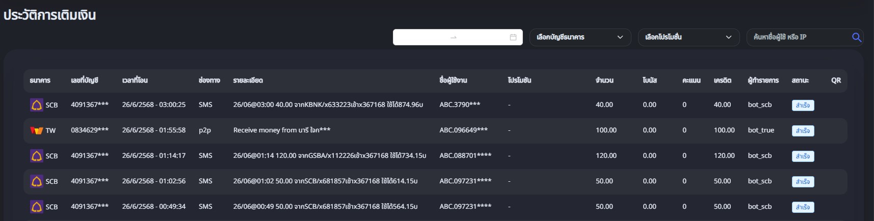 หน้าสำหรับแสดงประวัติการเติมเงิน