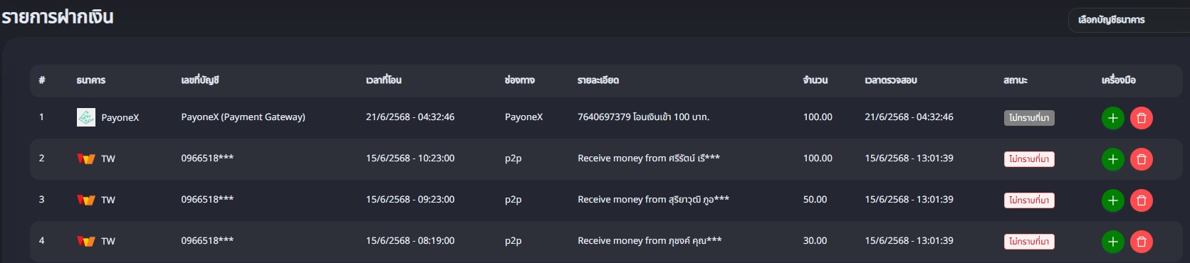 หน้าสำหรับแสดงรายการฝากเงิน
