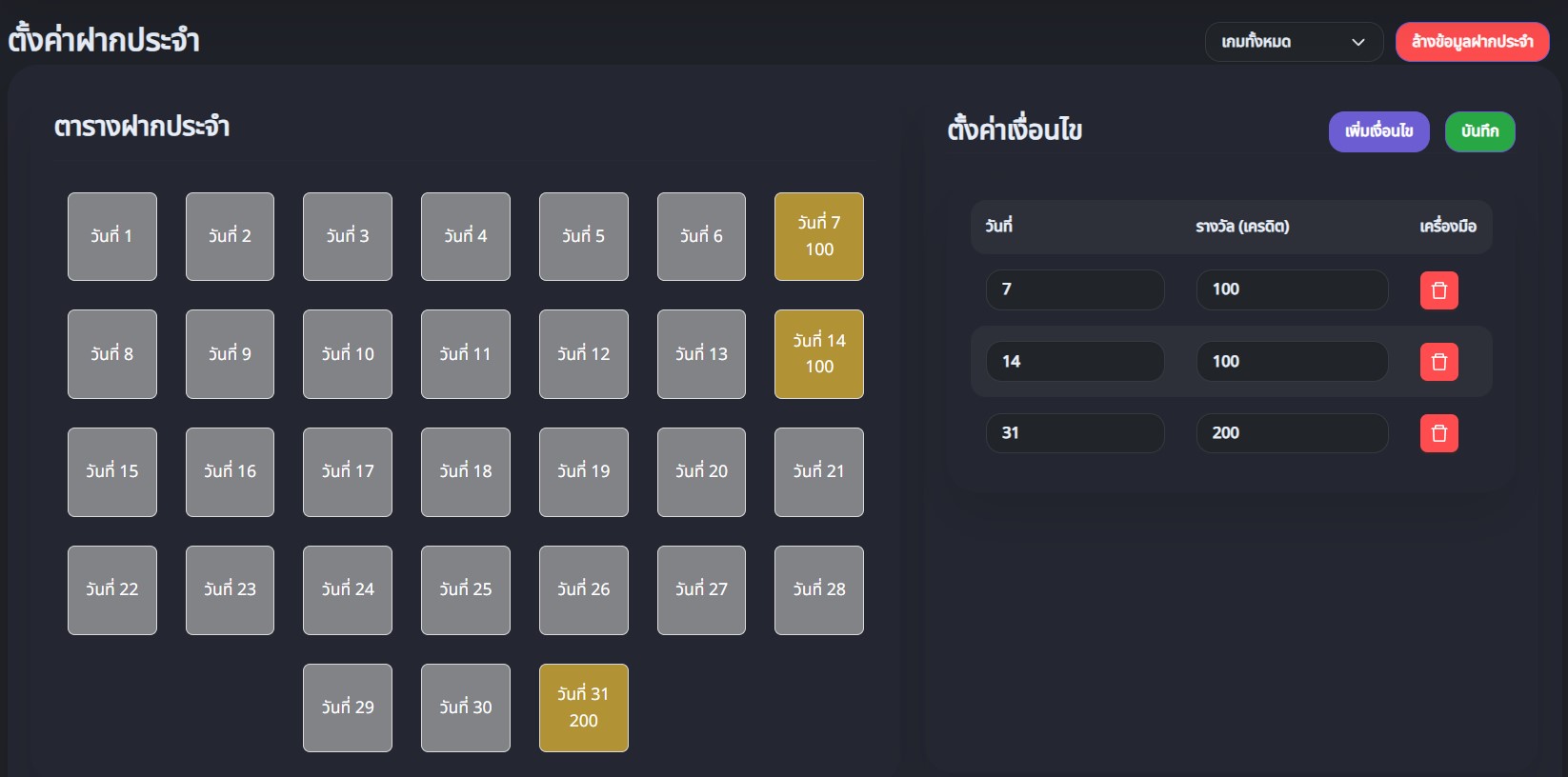 เช่น วันที่7รางวัล500 หากฝากประจำติดต่อกัน7วันจะได้รับเครดิต500และติดเทิร์น1เท่า - กดบันทึก