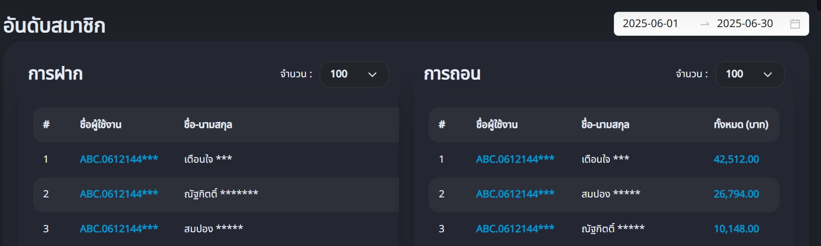 หน้าสำหรับแสดงข้อมูลอันดับสมาชิกฝาก-ถอนสูงสุด